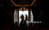 Staff menata kamar utama di resor cluster premium Paus Cottage di Putri Duyung Ancol, Jakarta Utara, Jumat (23/2/2024). PT Pembangunan Jaya Ancol Tbk meresmikan 3 unit Paus Cottage dari total 130 cluster di Putri Duyung bagi pengunjung yang ingin merasakan pengalaman menginap eksklusif di resor yang memiliki pemandangan laut Jakarta. (FOTO : Republika/Edwin Dwi Putranto)