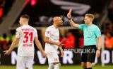 Wasit Timo Gerach (kanan) menunjukkan kartu merah kepada pemain Mainz Jessic Ngankam (tidak terlihat) saat pertandingan sepak bola Bundesliga Jerman antara Bayer Leverkusen dan FSV Mainz 05 di Leverkusen, Jerman, Sabtu (24/2/2024) dini hari WIB (FOTO : EPA)