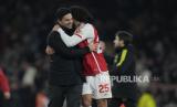 Pelatih Arsenal Mikel Arteta dan Mohamed Elneny merayakan kemenangan atas Newcastle United pada pertandingan sepak bola Liga Premier Inggris di stadion Emirates, London, Sabtu (2/2/2024). The Gunners menang besar 4-1 atas Newcastle United. Gol Arsenal dicetak Sven Botman yang melakukan gol bunuh diri di menit ke-18, Kai Havertz menit ke-24, Bukayo Saka menit ke-65, dan Jakub Kiwior menit ke-69. Satu gol The Magpies dicetak Joe Willock di menit ke-84. (FOTO : AP Photo/Alastair Grant)