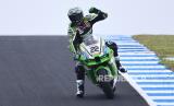 Pembalap Inggris Alex Lowes dari Kawasaki Racing Team WorldSBK melakukan selebrasi seusai menjadi yang tercepat pada WorldSBK Race 2 Kejuaraan Dunia Superbike di Phillip Island, Victoria, Australia, Ahad (25/2/2024). Alex Lowes berhasil menjuarai race 2 WSBK dengan catatan waktu 16 (FOTO : EPA-EFE/JOEL CARRETT)
