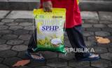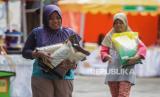 Warga membawa beras saat bazar pasar murah di Kantor Kecamatan Pancoran, Jakarta, Senin (26/2/2024). Bazar pasar murah yang menjual kebutuhan pokok seperti beras SPHP Rp 53.000, beras permium Rp 69.500, tepung terigu Rp 12.000 dan minyak goreng kita Rp 17.000 itu untuk membantu masyarakat mendapatkan barang kebutuhan pokok dengan harga terjangkau terutama beras yang mengalami kenaikan harga. (FOTO : Republika/Putra M. Akbar)