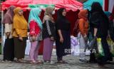 Warga mengantre untuk membeli bahan kebutuhan pokok saat bazar pasar murah di Kantor Kecamatan Pancoran, Jakarta, Senin (26/2/2024). Bazar pasar murah yang menjual kebutuhan pokok seperti beras SPHP Rp 53.000, beras permium Rp 69.500, tepung terigu Rp 12.000 dan minyak goreng kita Rp 17.000 itu untuk membantu masyarakat mendapatkan barang kebutuhan pokok dengan harga terjangkau terutama beras yang mengalami kenaikan harga. (FOTO : Republika/Putra M. Akbar)