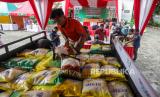 Petugas menurunkan beras yang dijual saat bazar pasar murah di Kantor Kecamatan Pancoran, Jakarta, Senin (26/2/2024). Bazar pasar murah yang menjual kebutuhan pokok seperti beras SPHP Rp 53.000, beras permium Rp 69.500, tepung terigu Rp 12.000 dan minyak goreng kita Rp 17.000 itu untuk membantu masyarakat mendapatkan barang kebutuhan pokok dengan harga terjangkau terutama beras yang mengalami kenaikan harga. (FOTO : Republika/Putra M. Akbar)