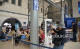 Calon penumpang tiket kereta api menunggu panggilan untuk mendapatkan pelayanan Customer Service di Stasiun Pasar Senen, Jakarta, Senin (26/2/2024). PT Kereta Api Indonesia (KAI) sudah mulai menjual tiket kereta api periode Angkutan Lebaran 2024. Hingga Senin (26/2/2024), tiket yang terjual tercatat 446.135 tiket atau 34 persen dari total tiket yang disediakan sebanyak 1.332.626 tiket. Penjualan tiket ini akan terus meningkat karena penjualan masih berlangsung. (FOTO : Republika/Prayogi)