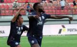 Pesepak bola Arema FC Charles Lokolingoy (kanan) bersama rekan setim berselebrasi usai mencetak gol ke gawang Persija Jakarta pada pertandingan BRI Liga 1 di Stadion Kapten I Wayan Dipta, Gianyar, Bali, Senin (26/2/2024). Arema FC mengalahkan Persija Jakarta dengan skor 3-2. (FOTO : ANTARA FOTO/Nyoman Hendra Wibowo)