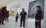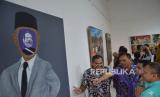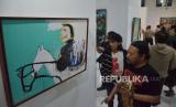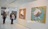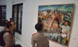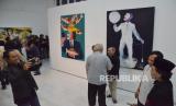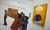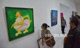 Pengunjung dan para seniman hadir saat pameran Semar Mendem Mesem karya sejumlah seniman ternama di antaranya Chryshnanda Dwilaksana, Isa Perkasa, Acep Zam-zam Noor, Pupung Prayitno, Joko Kisworo, dan Taat Joeda, di Galeri Pusat Kebudayaan, Jalan Naripan, Kota Bandung, Jawa Barat, Senin (26/2/2024). Dalam pameran lukisan tersebut para seniman menyampaikan pesan estetiknya dengan visual Semar yang berbeda beda, ada yang religius, estetik, kritis memaknai persoalan negeri ini. (FOTO : Edi Yusuf/Republika)