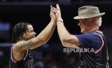 Aktor AS Neal McDonough (kanan) melakukan tos dengan Wham Middleton (kiri) setelah menjadi bintang tamu saat pertunjukan Tur Dunia Harlem Globetrotters 2024 di Los Angeles, California, AS, Senin (26/2/2024) WIB. Harlem Globetrotters adalah tim bola basket eksibisi AS yang menyajikan sisi menghibur dari olahraga basket. Harlem Globetrotters sudah tampil di 115 negara dan disaksikan sekitar 120 juta penonton. Mereka terus aktif menjadi tim basket eksebisionis dengan menggabungkan kehebatan individu, sirkus, dan komedi untuk menghibur penonton. (FOTO : EPA-EFE/CAROLINE BREHMAN )