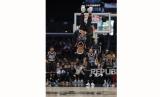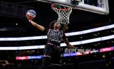Baller Moss melakukan slamdunk saat penampilan Tur Dunia Harlem Globetrotters 2024 di Los Angeles, California, AS, Senin (26/2/2024) WIB. Harlem Globetrotters adalah tim bola basket eksibisi AS yang menyajikan sisi menghibur dari olahraga basket. Harlem Globetrotters sudah tampil di 115 negara dan disaksikan sekitar 120 juta penonton. Mereka terus aktif menjadi tim basket eksebisionis dengan menggabungkan kehebatan individu, sirkus, dan komedi untuk menghibur penonton. (FOTO : EPA-EFE/CAROLINE BREHMAN  )