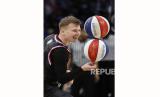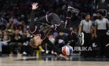 Diesel Kirkendoll melakukan flip saat penampilan Tur Dunia Harlem Globetrotters 2024 di Los Angeles, California, AS, Senin (26/2/2024) WIB. Harlem Globetrotters adalah tim bola basket eksibisi AS yang menyajikan sisi menghibur dari olahraga basket. Harlem Globetrotters sudah tampil di 115 negara dan disaksikan sekitar 120 juta penonton. Mereka terus aktif menjadi tim basket eksebisionis dengan menggabungkan kehebatan individu, sirkus, dan komedi untuk menghibur penonton. (FOTO : EPA-EFE/CAROLINE BREHMAN  )