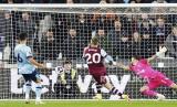 West Ham United Jarrod Bowen (tengah) mencetak gol saat pertandingan sepak bola Liga Premier Inggris antara West Ham United dan Brentford di Stadion London, London, Selasa (27/2/2024) dini har? WIB. (FOTO : Zac Goodwin/PA via AP)