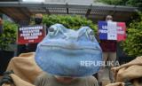 Aktivis People for the Ethical Treatment of Animals (PETA) menggunakan topeng kodok dan terkurung dalam karung goni saat menggelar aksi di depan Kedutaan Besar Prancis, Jakarta, Selasa (27/2/2024). Aksi tersebut mendesak Pemerintah Prancis untuk berhenti menyokong industri kodok yang kejam dan mengajak semua orang untuk berpartisipasi dalam penerapan gaya hidup vegan. (FOTO : Republika/Prayogi)