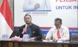 Ketua Bidang Hukum dan Hak Asasi Manusia DPP Partai Perindo Tama Satrya Langkun berbicara saat konferensi pers yang membahas Pernyataan Sikap atas Hilangnya Suara Partai Perindo pada Pemilu 2024 di Kantor DPP Partai Perindo, Jakarta, Rabu (28/2/2024). (FOTO : Dok.Republika)