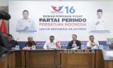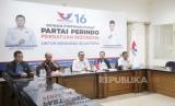 Ketua Bidang Hukum dan Hak Asasi Manusia DPP Partai Perindo Tama Satrya Langkun, Koordinator Juru Bicara Nasional DPP Partai Perindo Heri Budianto, Sekretaris Jenderal Partai Perindo Ahmad Rofiq, Wakil Ketua Umum DPP Partai Perindo Ferry Kurnia Rizkiyansyah, Ketua DPP Partai Perindo Abdul Khaliq Ahmad (dari kiri) dalam Konferensi Pers Pernyataan Sikap atas Hilangnya Suara Partai Perindo pada Pemilu 2024 di Kantor DPP Partai Perindo, Jakarta, Rabu (28/2/2024). (FOTO : Dok.Republika)