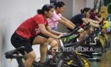 Pebulu tangkis tunggal putri Indonesia Gregoria Mariska Tunjung (kiri) dan Putri Kusuma Wardani (kedua kiri) mengayuh sepeda stastis saat mengikuti Pemusatan Latihan Nasional (Pelatnas) Bulu tangkis di PBSI Cipayung, Jakarta, Selasa (27/2/2024). PBSI menyiapkan pebulu tangkis Indonesia untuk menghadapi dua turnamen terdekat, yakni French Open dan All England Open 2024 pada Maret 2024. A (FOTO : ANTARA FOTO/M Risyal Hidayat)
