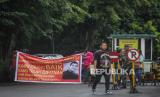 Keluarga dari Tersangka kasus pembunuhan Yudha Arfandi membentangkan spanduk dukungan saat rekonstruksi pembunuhan di Taman Air Tirtamas Pondok Kelapa, Jakarta Timur, Rabu (28/2/2024). Ditreskrimum Polda Metro Jaya melaksanakan rekonstruksi kasus pembunuhan putra artis Tamara Tyasmara, Raden Andante Khalif Pramudityo alias Dante dengan memperagakan 49 adegan di kolam renang sedalam 1,5 meter. (FOTO : Republika/Putra M. Akbar)