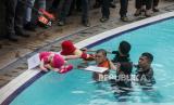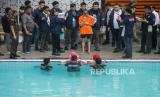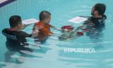 Tersangka kasus pembunuhan Yudha Arfandi melakukan adegan penenggelaman saat rekonstruksi pembunuhan di Taman Air Tirtamas Pondok Kelapa, Jakarta Timur, Rabu (28/2/2024). Ditreskrimum Polda Metro Jaya melaksanakan rekonstruksi kasus pembunuhan putra artis Tamara Tyasmara, Raden Andante Khalif Pramudityo alias Dante dengan memperagakan 49 adegan di kolam renang sedalam 1,5 meter. (FOTO : Republika/Putra M. Akbar)
