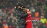 Manajer Liverpool Jurgen Klopp (kiri) memberi selamat kepada pemainnya Trey Nyoni di akhir pertandingan sepak bola putaran kelima Piala FA Inggris antara Liverpool dan Southampton di stadion Anfield, di Liverpool, Kamis (29/2/2024) dini hari WIB. (FOTO : AP)