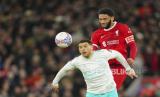 Joe Gomez dari Liverpool (atas) menyundul bola melewati pemain Southampton Che Adams selama pertandingan sepak bola putaran kelima Piala FA Inggris antara Liverpool dan Southampton di stadion Anfield, di Liverpool, Kamis (29/2/2024) dini hari WIB. (FOTO : AP)