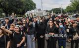 REPUBLIKA.CO.ID, JAKARTA -- Sejumlah Aktivis Jaringan Solidaritas Korban untuk Keadilan mengangkat tangan bersama saat menggelar Aksi Kamisan ke-807 di seberang Istana Merdeka, Jakarta, Kamis (29/2/2024).