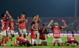 Sejumlah pesepak bola Bali United berselebrasi saat pertandingan Liga 1 2023/2024 melawan Persis Solo di Stadion Kapten I Wayan Dipta, Gianyar, Bali, Kamis (29/2/2024). Bali United berhasil mengalahkan Persis Solo dengan skor 3-2. (FOTO : ANTARA FOTO/Fikri Yusuf)