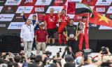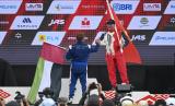 REPUBLIKA.CO.ID, BALIGE. -- Pendiri H2O Racing Nicolo Di San Germano, pembalap dari tim Victory Team Erik Stark, Pj Gubernur Sumatera Utara Hassanudin, pembalap dari tim Sharjah Rusty Wyatt, manajer tim Sharjah Scott Gillman, Menpora Dito Ariotedjo, dan pembalap tim Binh Dinh Vietnam Jonas Andersson berpose saat penyerahan trofi balap Kejuaraan Dunia Perahu Motor F1 Powerboat (F1H2O) 2024 di Danau Toba, Balige, Sumatera Utara, Ahad (3/3/2024).