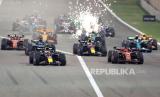 Pembalap Red Bull Racing Max Verstappen (depan Kiri) dari Belanda memimpin rombongan pada awal Grand Prix Formula Satu Bahrain, di Sirkuit Internasional Bahrain di Sakhir, Bahrain, Sabtu (2/3/2024). (FOTO : EPA)