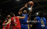 Pebasket Satria Muda Pertamina Jarred Dwayne Shaw (tengah) berusaha melewati hadangan pebasket Bali United Basketball dalam pertandingan Indonesia Basketball League (IBL) 2024 di GOR Pertamina Arena Simprug, Jakarta, Ahad (3/3/2024). Pada pertandingan tersebut Satria Muda Pertamina berhasil mengalahkan Bali United Basketball dengan skor akhir 101-88. (FOTO : Republika/Thoudy Badai)