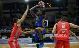 Pebasket Satria Muda Pertamina Curtis Lee Davis III berusaha melewati hadangan pebasket Bali United Basketball dalam pertandingan Indonesia Basketball League (IBL) 2024 di GOR Pertamina Arena Simprug, Jakarta, Ahad (3/3/2024). Pada pertandingan tersebut Satria Muda Pertamina berhasil mengalahkan Bali United Basketball dengan skor akhir 101-88. (FOTO : Republika/Thoudy Badai)