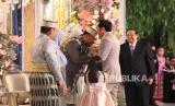 Presiden RI ke-6 Susilo Bambang Yudhoyono menghadiri resepsi pernikahan anak Menteri Pertanian Andi Amran Sulaiman yaitu Andi Amar Maruf Sulaiman dan mempelai wanita Ihsani Nurul Izzah di Birawa Assembly Hall Hotel Bidakara Jakarta, Ahad (3/3/2024). Hadir di antara undangan Presiden Joko Widodo beserta ibu Iriana dan Wakil Presiden RI KH. Maruf Amin beserta Ibu Wury dan para pejabat elit lainya. (FOTO : Dok Republika)