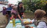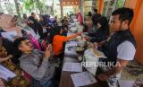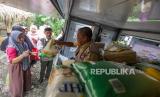 Warga membeli bahan kebutuhan pokok di Jalan Jambu, Mulyaharja, Kota Bogor, Jawa Barat, Senin (4/3/2024). Pemerintah terus mengupayakan membantu masyarakat mendapatkan barang kebutuhan pokok terutama beras yang mengalami kenaikan harga melalui program Bulog Siaga dan penyaluran Bantuan Sosial Cadangan Beras Pemerintah (Bansos CBP) untuk memenuhi kebutuhan pangan rumah tangga masyarakat. Bulog Siaga menyediakan kebutuhan pokok berupa beras SPHP dua ton, beras premium 500 kilogram, gula pasir 100 kilogram, minyak goreng 120 liter dan tepung beras 24 kilogram yang dijual untuk masyarakat dengan harga yang lebih murah di pasaran. Sedangkan, Bansos CBP berupa beras yang dibagikan secara gratis diperuntukan bagi masyarakat di 12 RW Kelurahan Mulyaharja yang membutuhkan. (FOTO : Republika/Putra M. Akbar)