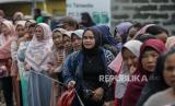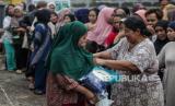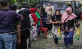 Warga mengantre untuk membeli kebutuhan bahan pokok saat penyelenggaraan program Bulog Siaga di Jalan Jambu, Mulyaharja, Kota Bogor, Jawa Barat, Senin (4/3/2024). Pemerintah terus mengupayakan membantu masyarakat mendapatkan barang kebutuhan pokok terutama beras yang mengalami kenaikan harga melalui program Bulog Siaga dan penyaluran Bantuan Sosial Cadangan Beras Pemerintah (Bansos CBP) untuk memenuhi kebutuhan pangan rumah tangga masyarakat. Bulog Siaga menyediakan kebutuhan pokok berupa beras SPHP dua ton, beras premium 500 kilogram, gula pasir 100 kilogram, minyak goreng 120 liter dan tepung beras 24 kilogram yang dijual untuk masyarakat dengan harga yang lebih murah di pasaran. Sedangkan, Bansos CBP berupa beras yang dibagikan secara gratis diperuntukan bagi masyarakat di 12 RW Kelurahan Mulyaharja yang membutuhkan. (FOTO : Republika/Putra M. Akbar)