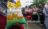 Warga membeli beras saat penyelenggaraan program Bulog Siaga di Jalan Jambu, Mulyaharja, Kota Bogor, Jawa Barat, Senin (4/3/2024). Pemerintah terus mengupayakan membantu masyarakat mendapatkan barang kebutuhan pokok terutama beras yang mengalami kenaikan harga melalui program Bulog Siaga dan penyaluran Bantuan Sosial Cadangan Beras Pemerintah (Bansos CBP) untuk memenuhi kebutuhan pangan rumah tangga masyarakat. Bulog Siaga menyediakan kebutuhan pokok berupa beras SPHP dua ton, beras premium 500 kilogram, gula pasir 100 kilogram, minyak goreng 120 liter dan tepung beras 24 kilogram yang dijual untuk masyarakat dengan harga yang lebih murah di pasaran. Sedangkan, Bansos CBP berupa beras yang dibagikan secara gratis diperuntukan bagi masyarakat di 12 RW Kelurahan Mulyaharja yang membutuhkan. (FOTO : Republika/Putra M. Akbar)