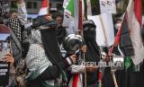 Sejumlah massa melakukan aksi solidaritas untuk Palestina di depan Kedubes Mesir, Jakarta, Senin (4/3/2024). Dalam aksi tersebut mereka mendesak Mesir untuk mencegah bencana kelaparan di Gaza akibat genosida Israel yaitu dengan membuka pintu perbatasan Rafah. (FOTO : Republika/Prayogi)