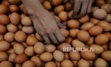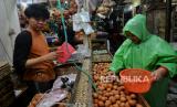 Pedagang telur  melayani pembeli di pasar tradisional Pasar Minggu, Jakarta Selatan, Senin (4/3/2024). Sepekan menjelang bulan suci Ramadhan 1445 Hijriah, sejumlah harga pangan pokok mulai merangkak naik di Pasar Minggu. Untuk harga daging ayam mengalami kenaikan Rp2.000 sampai Rp3.000 dari harga Rp32.000 per ekor, kini seharga Rp35.000 per ekor, harga telur sebelumnya Rp27.000 menjadi Rp30.000 sementara untuk harga daging sapi mengalami kenaikan sebesar Rp10.000 dari Rp125.000 per kilogram kini mencapai Rp135.000 per kilogram. kenaikan tersebut dikeluhkan sejumlah pedagang, pasalnya, daya beli masyarakat mengalami penurunan imbas dari melonjaknya sejumlah harga pangan pokok lainnya. (FOTO : Republika/Thoudy Badai)