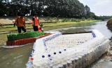 Sejumlah petugas Unit Penanganan Sampah Badan Air Dinas Lingkungan Hidup mengangkat perahu berbahan botol plastik bekas di Duren Sawit, Jakarta Timur, Selasa (5/3/2024). Menurut petugas UPS Badan Air sebanyak 1.000 botol plastik dimanfaatkan untuk pembuatan perahu selama dua minggu yang bisa membawa enam orang saat melakukan pembersihan sampah di aliran Kanal Banjir Timur. (FOTO : ANTARA FOTO/ Fakhri Hermansyah)