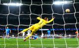 Tendangan pemain Real Madrid Vinicius Junior gagal digapai kiper RB Leipzig saat pertandingan sepak bola leg kedua babak 16 besar Liga Champions di stadion Santiago Bernabeu di Madrid, Spanyol, Kamis (7/3/2024) WIB. Madrid berhasil lolos ke babak perempat final Liga Champions setelah bermain imbang 1-1 dengan RB Leipzig. Gol Madrid dicetak Vinicius Junior di menit ke-65. Sedangkan satu gol Leipzig dicetak Willi Orban di menit ke-68. (FOTO : AP Photo/Manu Fernandez)