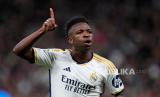 Pemain Real Madrid Vinicius Junior melakukan selebrasi seusai mencetak gol saat pertandingan sepak bola leg kedua babak 16 besar Liga Champions melawan RB Leipzig di stadion Santiago Bernabeu di Madrid, Spanyol, Kamis (7/3/2024) WIB. Madrid berhasil lolos ke babak perempat final Liga Champions setelah bermain imbang 1-1 dengan RB Leipzig. Gol Madrid dicetak Vinicius Junior di menit ke-65. Sedangkan satu gol Leipzig dicetak Willi Orban di menit ke-68. (FOTO : AP Photo/Manu Fernandez)