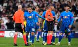 Para pemain Leipzig berbicara dengan wasit di penghujung pertandingan sepak bola leg kedua babak 16 besar Liga Champions antara Real Madrid dan RB Leipzig di stadion Santiago Bernabeu di Madrid, Spanyol, Kamis (7/3/2024) WIB. Madrid berhasil lolos ke babak perempat final Liga Champions setelah bermain imbang 1-1 dengan RB Leipzig. Gol Madrid dicetak Vinicius Junior di menit ke-65. Sedangkan satu gol Leipzig dicetak Willi Orban di menit ke-68. (FOTO : AP Photo/Manu Fernandez)