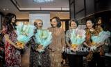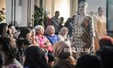 Managing Director Batik Danar Hadi Diana Santosa (tengah) memberikan apresiasi untuk pelanggan setia Batik Danar Hadi disela peragaan busana di Jakarta, Kamis (7/3/2024). Batik Danar Hadi menyelenggarakan pagelaran busana tahunan untuk koleksi hari raya bertema Sekar Arumdati yang menghadirkan potongan modern seperti tunik, dress, celana rok dan outer. (FOTO : Republika/Putra M. Akbar)