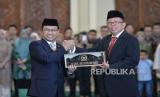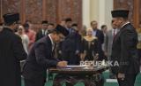 Anggota DPR Fraksi Partai Persatuan Pembangunan (PPP) Amir Uskara menandatangani berita acara pelantikan disaksikan Ketua MPR RI Bambang Soesatyo saat Upacara Pengucapan Sumpah/Janji Wakil Ketua MPR di Gedung Nusantara IV, Kompleks Parlemen, Senayan, Jakarta, Jumat (8/3/2024). Amir Uskara resmi dilantik menjadi Wakil Ketua MPR RI menggantikan posisi Arsul Sani yang saat ini menjabat sebagai hakim Mahkamah Konstitusi. (FOTO : Republika/Prayogi)