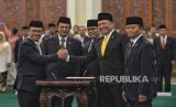 Anggota DPR Fraksi Partai Persatuan Pembangunan (PPP) Amir Uskara (kiri) berjabat tangan dengan Ketua MPR RI Bambang Soesatyo (dua kanan) didampingi pimpinan MPR lainnya saat Upacara Pengucapan Sumpah/Janji Wakil Ketua MPR di Gedung Nusantara IV, Kompleks Parlemen, Senayan, Jakarta, Jumat (8/3/2024). Amir Uskara resmi dilantik menjadi Wakil Ketua MPR RI menggantikan posisi Arsul Sani yang saat ini menjabat sebagai hakim Mahkamah Konstitusi. (FOTO : Republika/Prayogi)