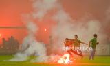 Suporter Semen Padang FC menyalakan flare saat pertandingan final leg kedua Liga 2 melawan PSBS Biak di Stadion GOR H Agus Salim Padang, Sumatera Barat, Sabtu (9/3/2024). Laga tersebut sempat dihentikan sekitar 20 menit dan wasit memutuskan pertandingan dihentikan di menit ke-81 dengan skor akhir 3-0 untuk kemenangan PSBS Biak yang sukses merebut gelar juara Liga 2 dengan agregat 6-0. (FOTO : ANTARA FOTO/Iggoy el Fitra)