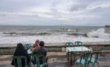 REPUBLIKA.CO.ID, MATARAM -- Warga duduk di pinggir pantai saat terjadi gelombang tinggi di Pantai Ampenan, Mataram, NTB, Ahad (10/3/2024).
