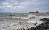 Sebuah kapal tanker pengangkut BBM menepi saat gelombang tinggi di perairan pantai Ampenan, Mataram, NTB, Ahad (10/3/2024). Badan Meteorologi, Klimatologi dan Geofisika (BMKG) Stasiun Meteorologi Zainuddin Abdul Majid memberikan peringatan dini waspada gelombang setinggi 2 meter hingga 4 meter terjadi diperairan Selat Lombok bagian utara dan selatan, Selat Alas bagian utara dan selatan, perairan utara Sumbawa, Selat Sape bagian utara dan selatan dan Samudera Hindia selatan NTB. (FOTO : ANTARA FOTO/Ahmad Subaidi)