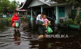Warga berjalan melewati banjir di Jalan Pelatuk IV, Palangka Raya, Kalimantan Tengah, Ahad (10/3/2024). Curah hujan yang tinggi serta meluapnya Sungai Kahayan, Rungan, dan Sebangau mengakibatkan 16 kelurahan di empat kecamatan Kota Palangka Raya terendam banjir. (FOTO : ANTARA FOTO/Auliya Rahman)