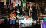 Warga membeli bahan pokok di toko yang terendam banjir di Jalan Anoi, Palangka Raya, Kalimantan Tengah, Ahad (10/3/2024). Curah hujan yang tinggi serta meluapnya Sungai Kahayan, Rungan, dan Sebangau mengakibatkan 16 kelurahan di empat kecamatan Kota Palangka Raya terendam banjir. (FOTO : ANTARA FOTO/Auliya Rahman)
