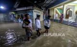 Umat Islam setempat tetap khusyuk menjalankan shalat Tarawih pertama di bulan Ramadhan meski banjir menggenangi kawasan pemukiman tersebut.