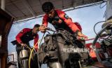 Dua anggota Basarnas Spesial Grup menyiapkan peralatan selam di KM SAR Antasena, Jakarta, Selasa (12/3/2024). Basarnas DKI Jakarta bersama TNI dan Polri menerjunkan 100 personil untuk melaksanakan pencarian seorang warga negara asing asal Taiwan yang menjadi korban KM Pari Kudus terbalik di perairan Kepulauan Seribu. (FOTO : ANTARA FOTO/Bayu Pratama S)