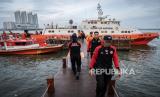 REPUBLIKA.CO.ID, JAKARTA -- Sejumlah anggota Basarnas memuat peralatan pencarian ke dalam KM SAR Antasena di Dermaga Basarnas Pantai Mutiara, Jakarta, Selasa (12/3/2024).