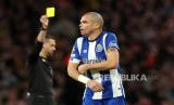 Kapten Porto Pepe mendapat kartu kuning oleh wasit Clement Turpin selama pertandingan leg kedua babak 16 besar Liga Champions UEFA antara Arsenal dan Porto di London, Inggris, Rabu (13/3/2024) dini hari WIB. (FOTO : EPA-EFE/NEIL HALL)